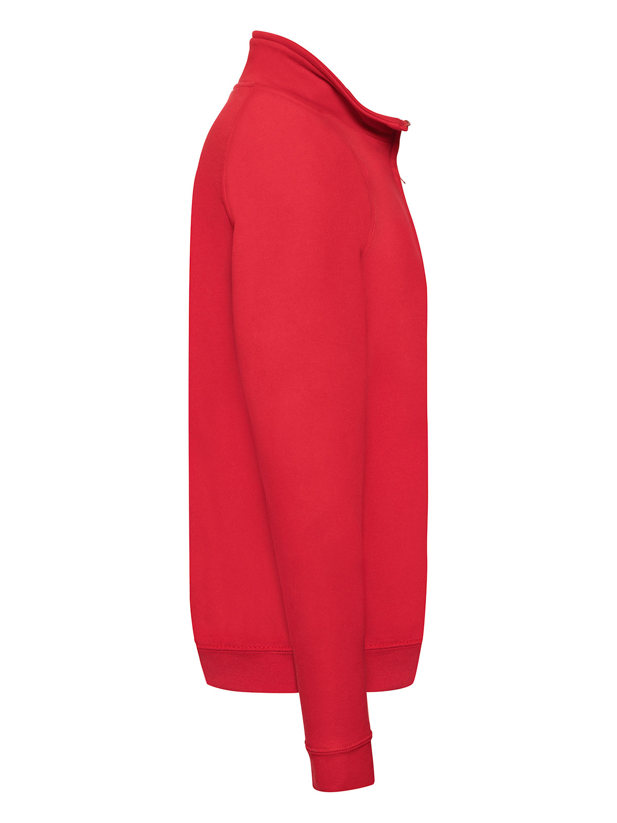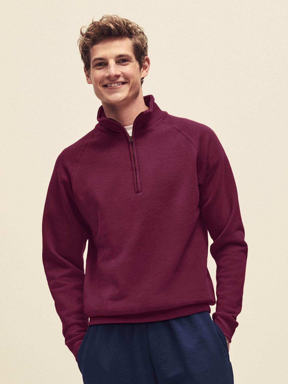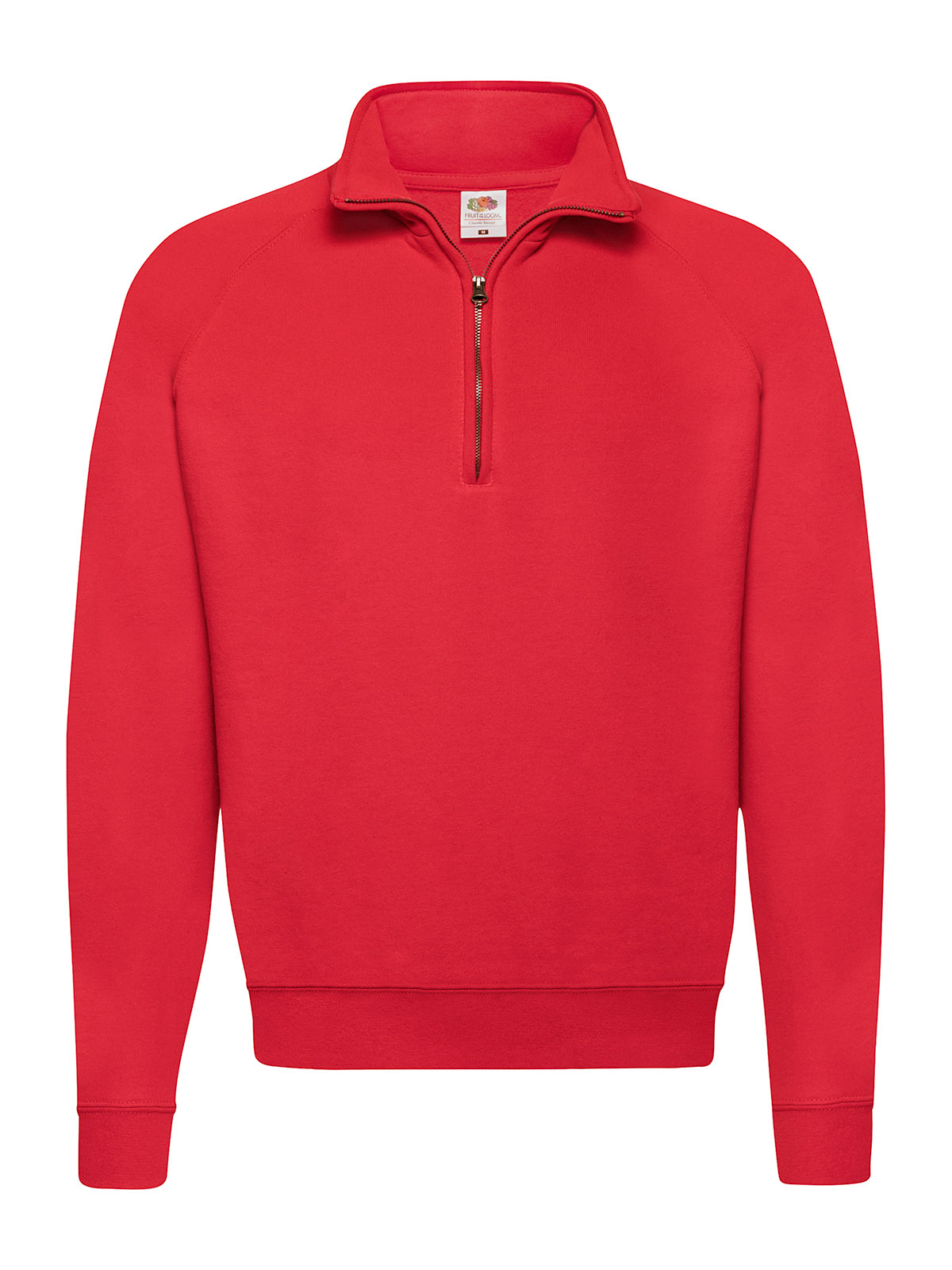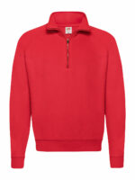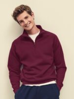 80% cotone, 20% poliestere. Felpa con maniche raglan, zip ¼ con tiralampo, felpata internamente, struttura con cuciture laterali.